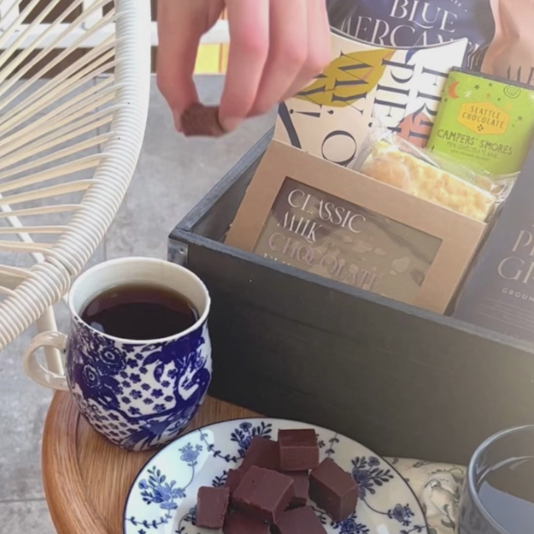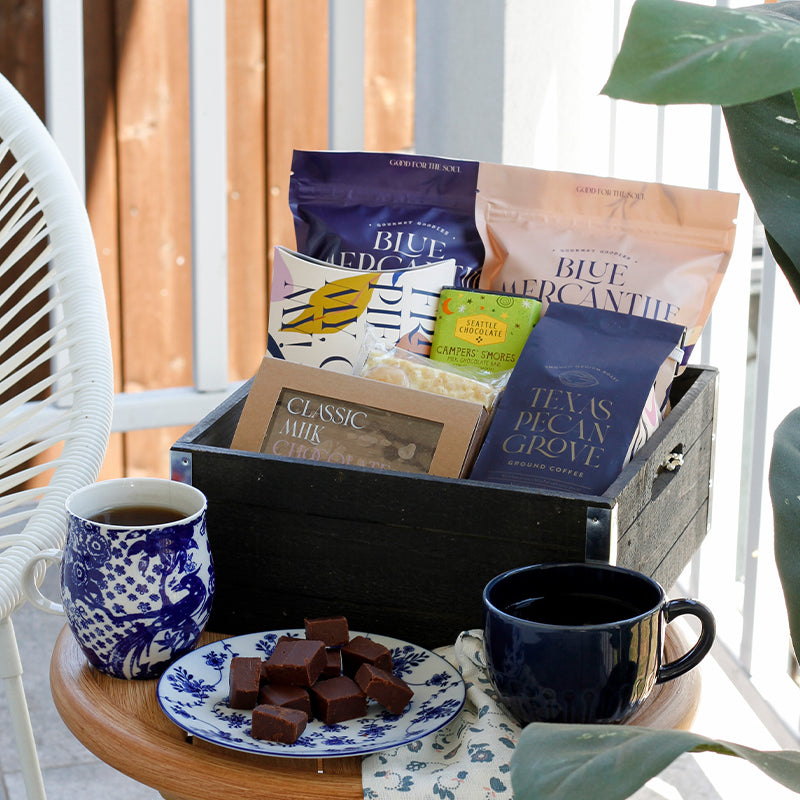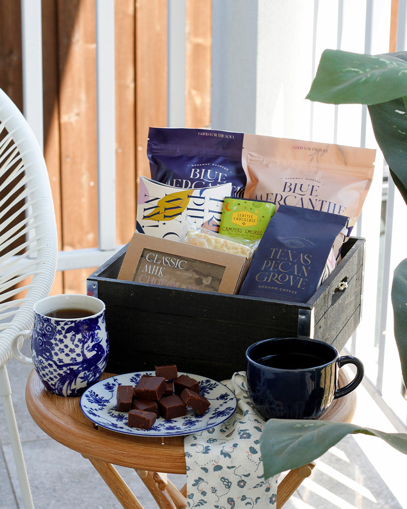Chatting with friends is always made better with a teaming mug of coffee and a good box of sweets. Loaded with milk chocolate fudge, a Campers’ S’mores truffle chocolate bar, chocolate covered pretzels, a massive banana pudding rice crispy, coconut fried pies, and our sweet and savory Tejano trail mix. You could chat for hours.