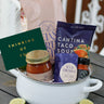 Delicious Cantina Taco Soup that is heartwarming and oh so filling. Top it with aged cheddar cheese and a squeeze of lime, with restaurant-style tortilla chips and piquant salsa on the side. Includes our charming white dutch oven, keepsake “Good for the Soul” tea towel, and our lux Goodies "Thinking of You" card.