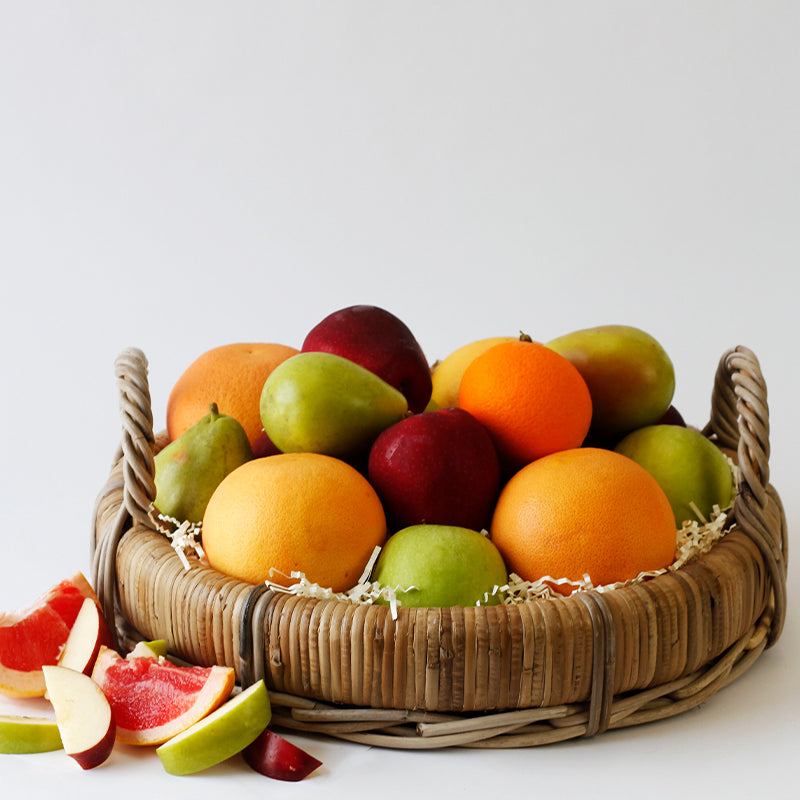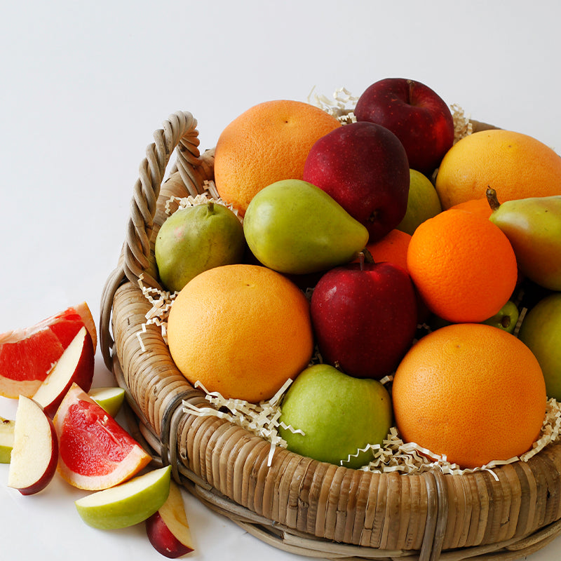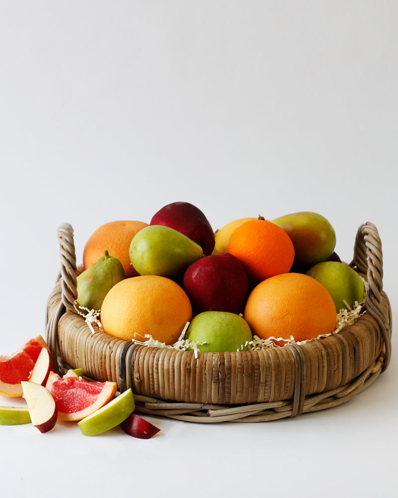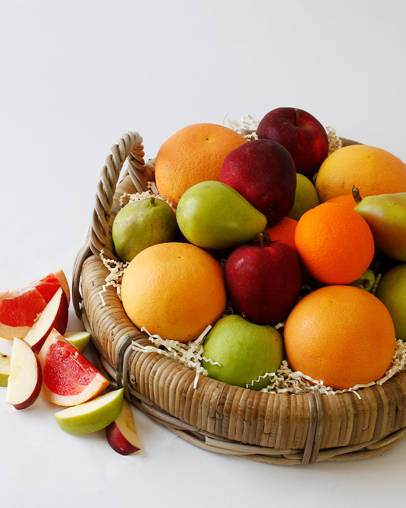A colorful bounty of fresh, hand-selected fruits—crisp apples, juicy oranges, ruby red grapefruit, and golden pears—arranged beautifully in a charming wicker tray. Perfect for gifting or enjoying at home, it’s a playful, elevated way to celebrate seasonal flavors.