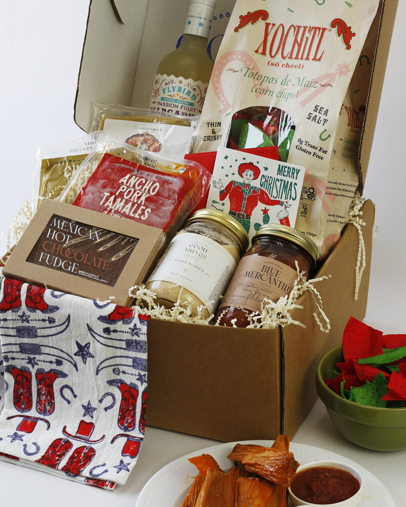 Indulge in a trio of best selling tamales from The Tamale Company in Dallas, TX featuring flavors like ancho chile pork, tomatillo chicken, and southwest black bean. This crate also includes creamy queso blanco, Our Favorite Salsa and restaurant-style tortilla chips. Oh, and of course a bottle of lime margarita wine cocktail, and Mexican Hot Chocolate Fudge.