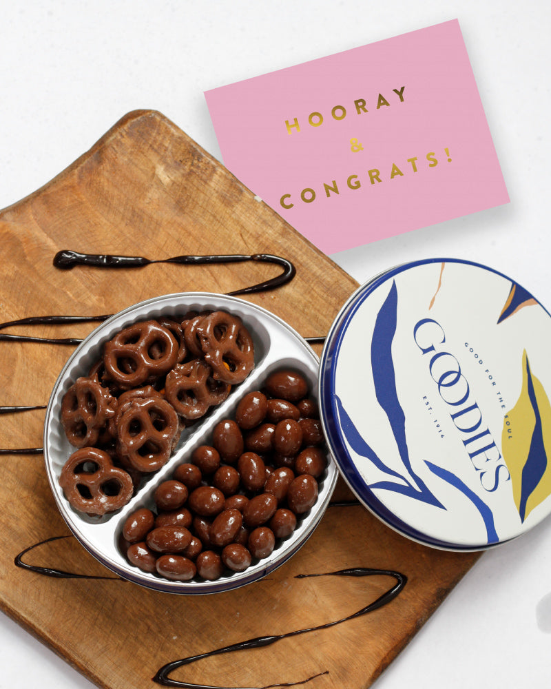Just a quick reminder that you are on your loved ones mind. One half of this tin is filled with rich milk-chocolate drenched pretzels. The other half with German almonds, just like the almonds at Germany’s Christkindlmarkt... but dipped in luscious chocolate.