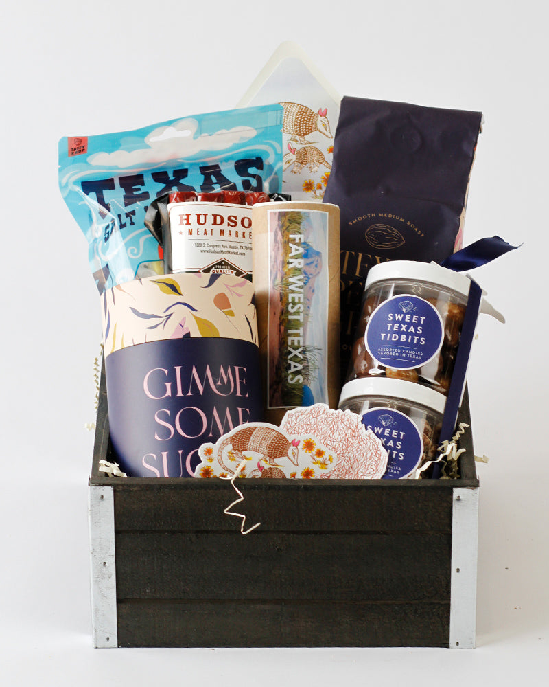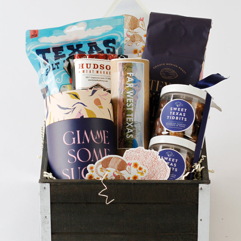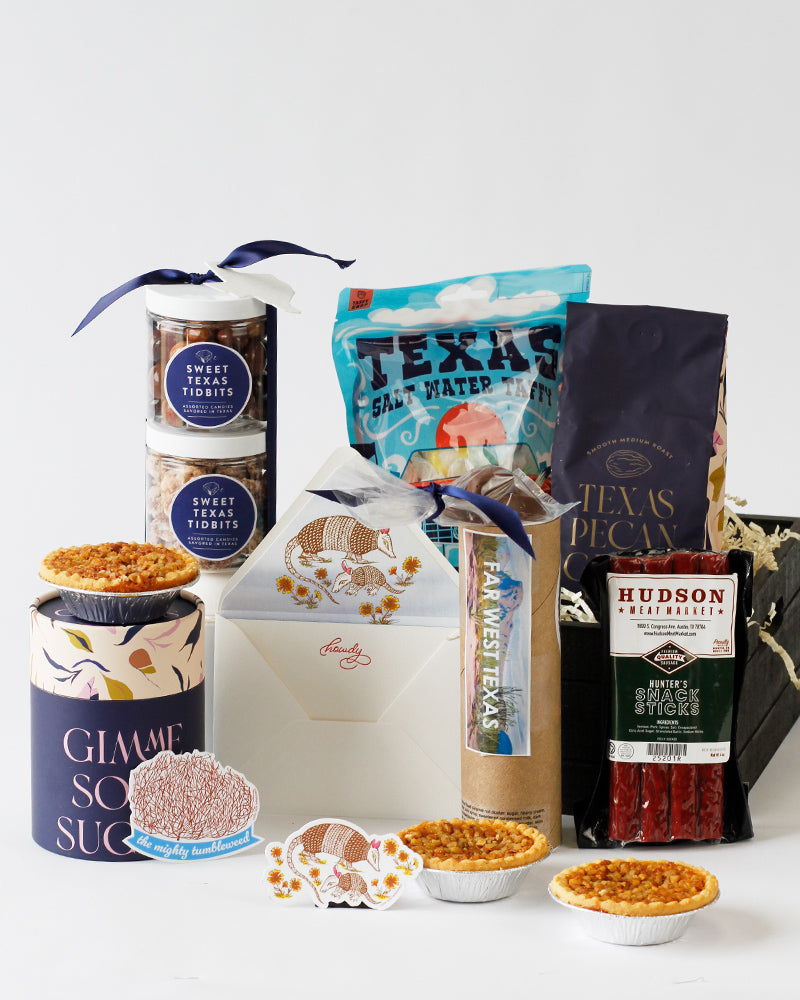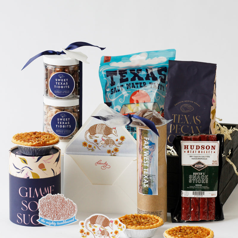 Embrace the rugged charm of West Texas with a selection of treats that capture its unique flavor. Enjoy a cup of rich Butter Pecan Coffee paired with mini pecan pies and candied praline pecans, offering a taste of the region’s beloved ingredients. The Far Out West Gift Basket brings a touch of the Texas frontier to life with delightful armadillo-themed items and a blend of sweet and savory snacks that embody the spirit of the West Texas landscape.