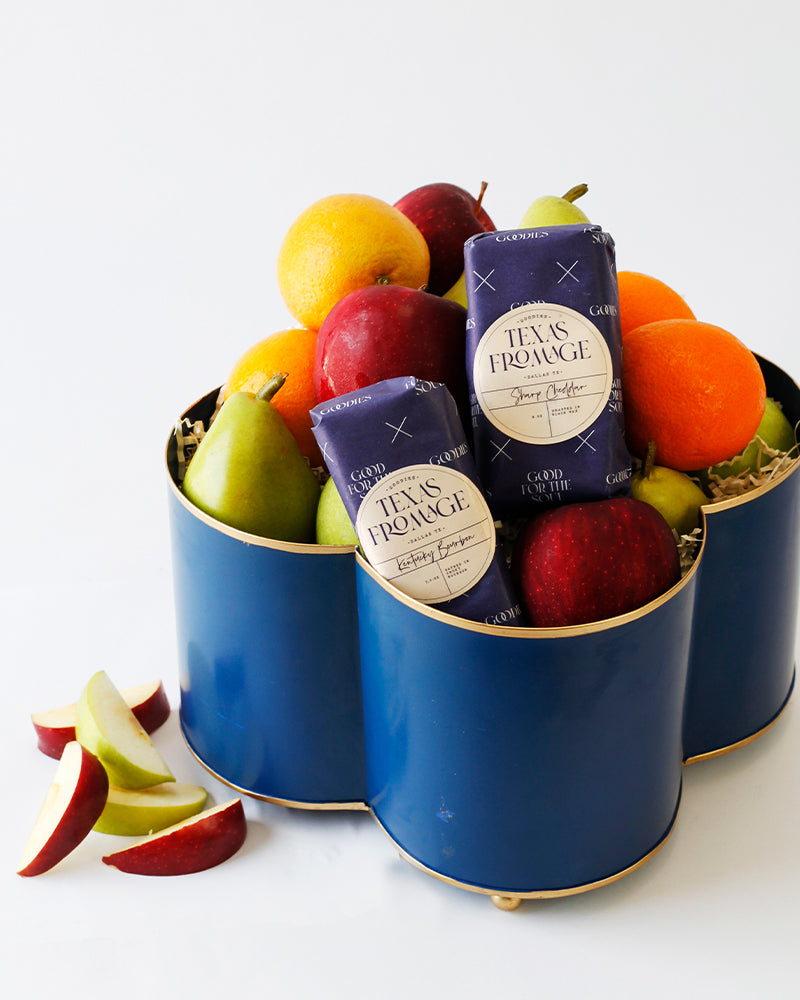 A generous collection of crisp apples, juicy oranges, and golden pears paired with rich aged and bourbon cheeses comes beautifully presented in a luxe navy crate. Perfectly balanced and elegantly arranged, it’s a playful, elevated take on classic fruit and cheese gifting.