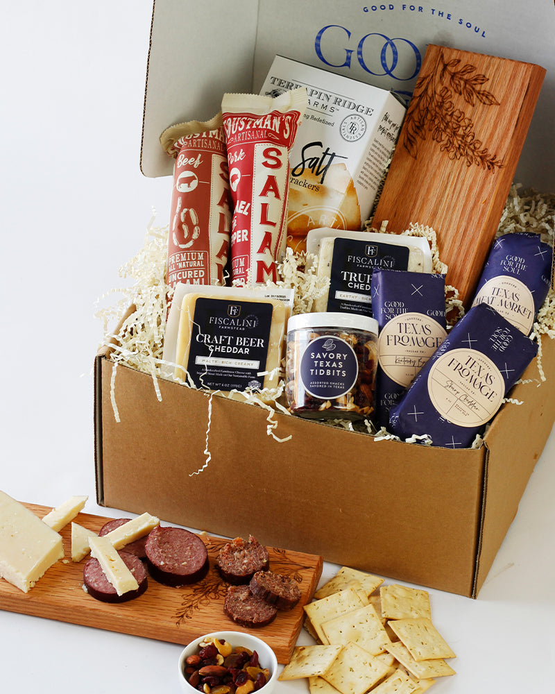 Bold flavors meet Texas craftsmanship in this charcuterie crate, featuring a lineup of savory salamis, rich cheeses, and our signature vineyard mix. Paired with our full-bodied red wine, sea salt crackers, bacon pepper jam, and a custom oak board, it’s a gift made for sipping, grazing, and savoring every bite.